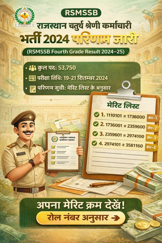राजस्थान चतुर्थ श्रेणी कर्मचारी भर्ती 2024 का परिणाम लाखों अभ्यर्थियों के लिए बड़ी राहत और खुशी की खबर है। जिन अभ्यर्थियों का नाम मेरिट सूची में आया है, उन्हें आगामी प्रक्रिया के लिए तैयार रहना चाहिए।