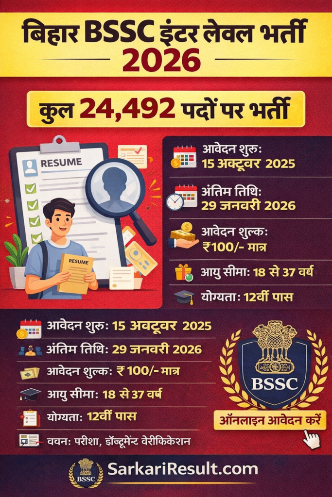 рдмрд┐рд╣рд╛рд░ рдХрд░реНрдордЪрд╛рд░реА рдЪрдпрди рдЖрдпреЛрдЧ (BSSC) рдиреЗ Inter Level Recruitment 2026 рдХрд╛ рдиреЛрдЯрд┐рдлрд┐рдХреЗрд╢рди рдЬрд╛рд░реА рдХрд░ рджрд┐рдпрд╛ рд╣реИред рдЗрд╕ рднрд░реНрддреА рдХреЗ рдорд╛рдзреНрдпрдо рд╕реЗ рдХреБрд▓ 24,492 рдкрджреЛрдВ рдкрд░ рдЙрдореНрдореАрджрд╡рд╛рд░реЛрдВ рдХрд╛ рдЪрдпрди рдХрд┐рдпрд╛ рдЬрд╛рдПрдЧрд╛ред рдЬреЛ рдЕрднреНрдпрд░реНрдереА 12рд╡реАрдВ рдкрд╛рд╕ рд╣реИрдВ, рдЙрдирдХреЗ рд▓рд┐рдП рдпрд╣ рдПрдХ рд╕реБрдирд╣рд░рд╛ рдЕрд╡рд╕рд░ рд╣реИред