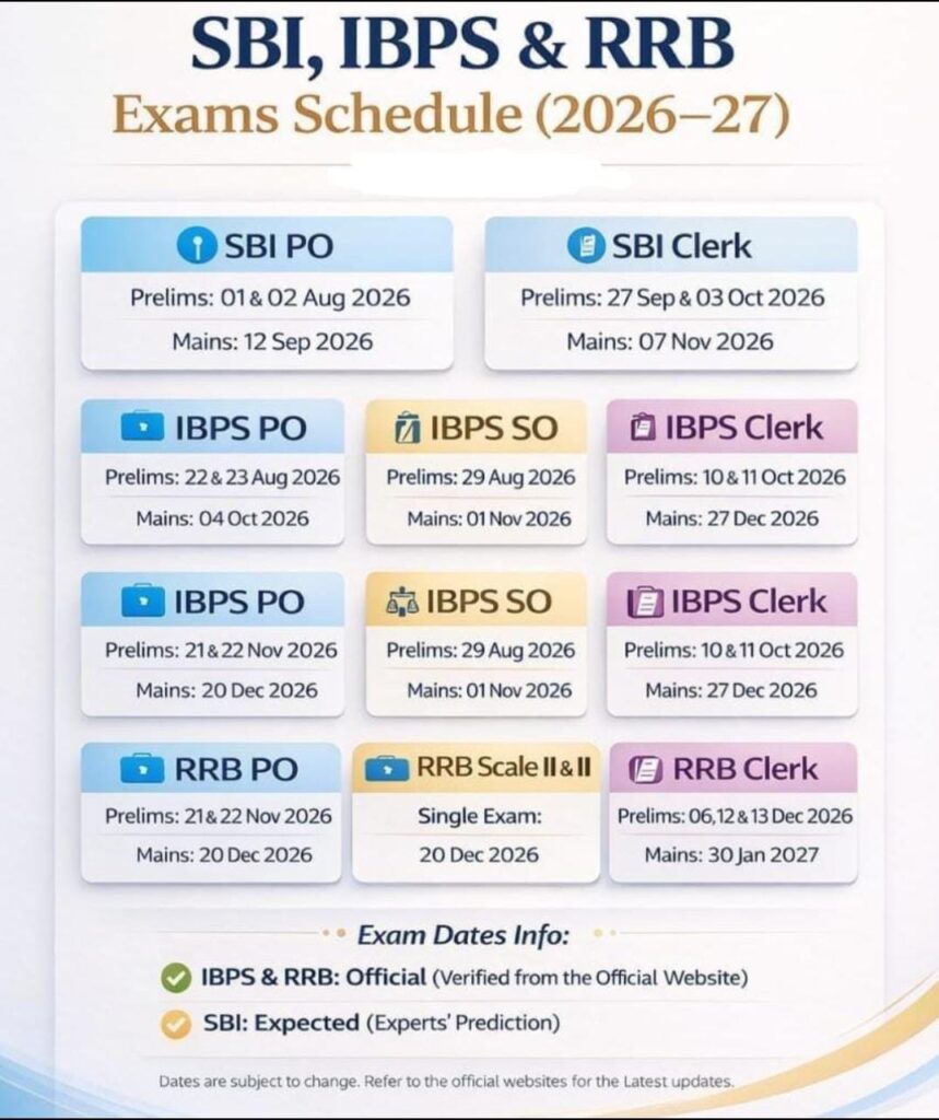 рдмреИрдВрдХрд┐рдВрдЧ рдХреА рддреИрдпрд╛рд░реА рдХрд░ рд░рд╣реЗ рдЙрдореНрдореАрджрд╡рд╛рд░реЛрдВ рдХреЗ рд▓рд┐рдП рдмрдбрд╝реА рдЦрдмрд░ рд╣реИред SBI, IBPS рдФрд░ RRB рдкрд░реАрдХреНрд╖рд╛рдУрдВ рдХрд╛ рд╕рдВрднрд╛рд╡рд┐рдд/рдЖрдзрд┐рдХрд╛рд░рд┐рдХ рдПрдЧреНрдЬрд╛рдо рд╢реЗрдбреНрдпреВрд▓ 2026тАУ27 рд╕рд╛рдордиреЗ рдЖ рдЧрдпрд╛ рд╣реИред рдЗрд╕рд╕реЗ рдЕрднреНрдпрд░реНрдереА рдЕрдкрдиреА рддреИрдпрд╛рд░реА рдХреЛ рд╕рд╣реА рджрд┐рд╢рд╛ рдореЗрдВ рдкреНрд▓рд╛рди рдХрд░ рд╕рдХрддреЗ рд╣реИрдВред