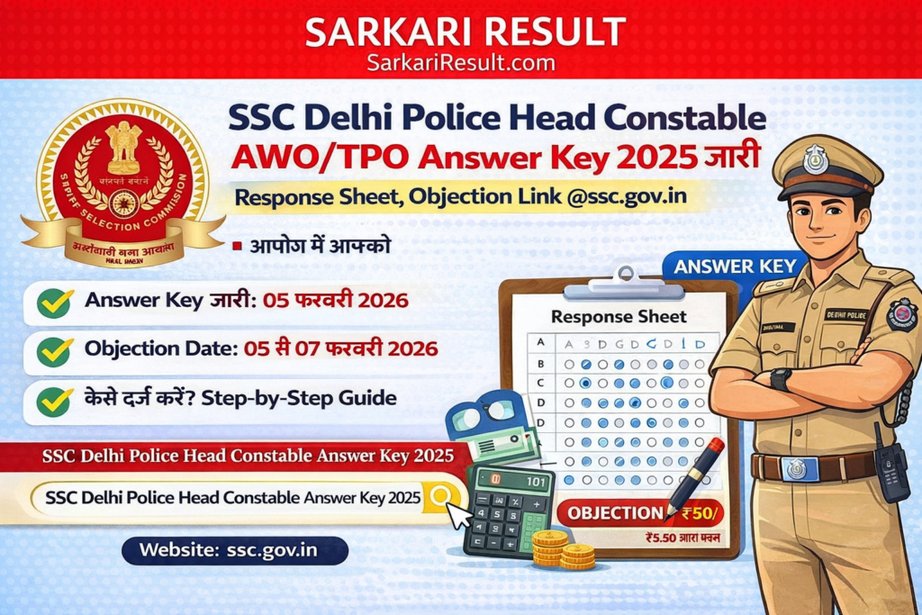 SSC Delhi Police Head Constable Answer Key 2025 का इंतजार कर रहे उम्मीदवारों के लिए बड़ी खबर है। Staff Selection Commission (SSC) ने Delhi Police Head Constable (Assistant Wireless Operator – AWO / Tele-Printer Operator – TPO) Examination 2025 की Tentative Answer Key आधिकारिक वेबसाइट पर जारी कर दी है। इसके साथ ही उम्मीदवार अपनी Question Paper cum Response Sheet भी डाउनलोड कर सकते हैं और जरूरत पड़ने पर Answer Key पर आपत्ति (Objection) भी दर्ज कर सकते हैं।