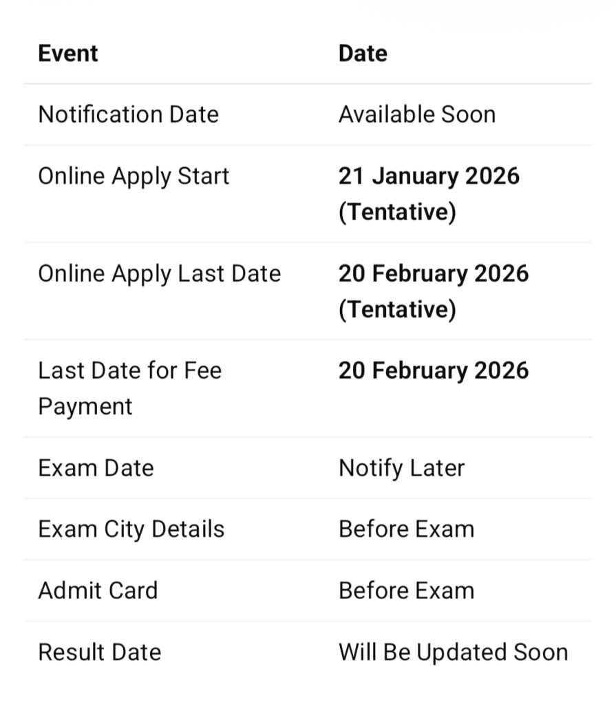 рдпрд╣ рдЬрд╛рдирдХрд╛рд░реА рдкреНрд░рд╛рд░рдВрднрд┐рдХ (Tentative) рд╣реИред рдЙрдореНрдореАрджрд╡рд╛рд░реЛрдВ рдХреЛ рд╕рд▓рд╛рд╣ рджреА рдЬрд╛рддреА рд╣реИ рдХрд┐ рдЖрд╡реЗрджрди рдХрд░рдиреЗ рд╕реЗ рдкрд╣рд▓реЗ рдЖрдзрд┐рдХрд╛рд░рд┐рдХ рдиреЛрдЯрд┐рдлрд┐рдХреЗрд╢рди рдЬрд░реВрд░ рдкрдврд╝реЗрдВред