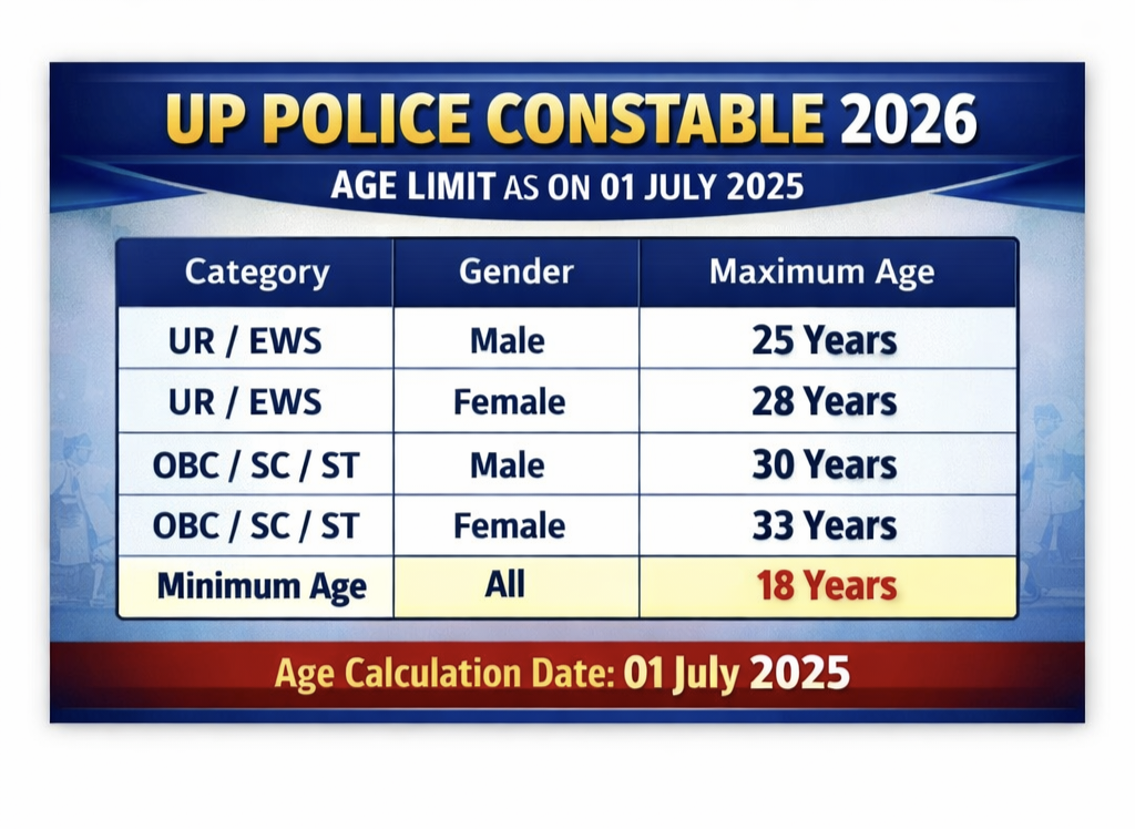 рдЕрдЧрд░ рдЖрдкрдХреА рдЙрдореНрд░ 01 July 2025 рдХреЗ рдЕрдиреБрд╕рд╛рд░ рддрдп рд╕реАрдорд╛ рдореЗрдВ рдЖрддреА рд╣реИ, рддреЛ UP Police Constable 2026 рдЖрдкрдХреЗ рд▓рд┐рдП рдмреЗрд╣рддрд░реАрди рдЕрд╡рд╕рд░ рд╣реИред рдЕрднреА рд╕реЗ рд▓рд┐рдЦрд┐рдд рдкрд░реАрдХреНрд╖рд╛ рдФрд░ рдлрд┐рдЬрд┐рдХрд▓ рдЯреЗрд╕реНрдЯ рдХреА рддреИрдпрд╛рд░реА рд╢реБрд░реВ рдХрд░ рджреЗрдВред