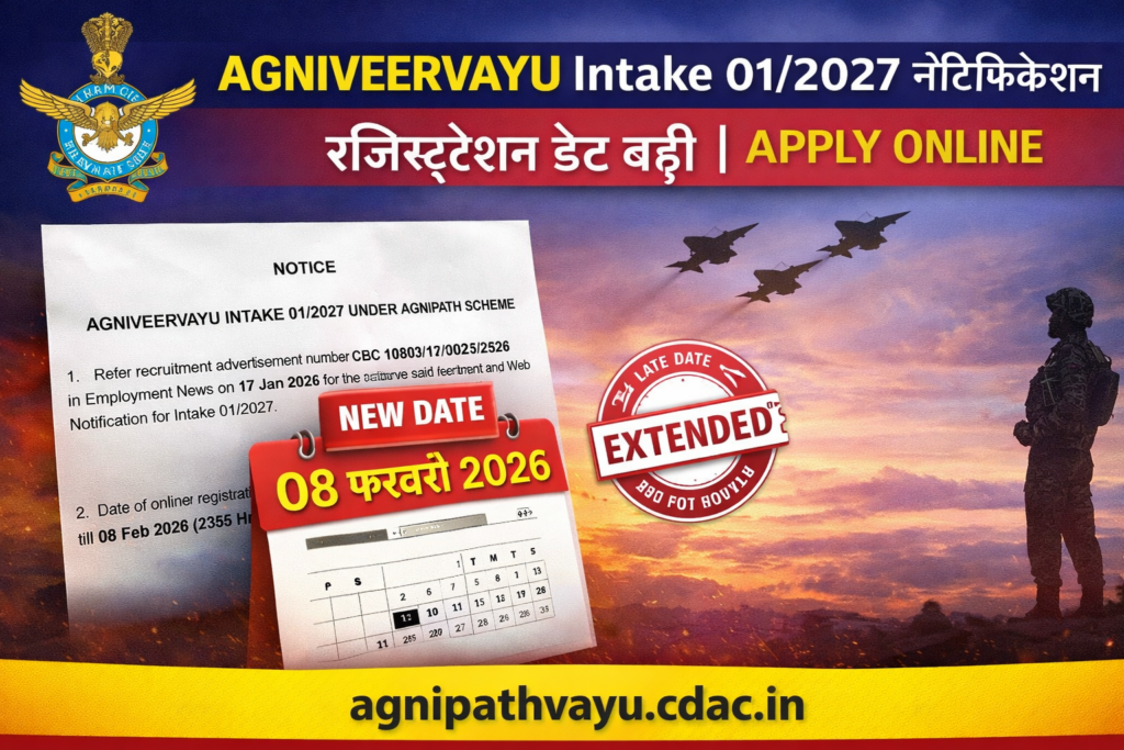 भारतीय वायुसेना (Indian Air Force) ने Agniveervayu Intake 01/2027 के लिए एक महत्वपूर्ण Notice जारी किया है। इस नोटिस के अनुसार Agnipath Scheme के तहत होने वाली भर्ती के लिए Online Registration की अंतिम तिथि बढ़ा दी गई है। जिन उम्मीदवारों ने अभी तक आवेदन नहीं किया है, उनके लिए यह एक सुनहरा मौका है।