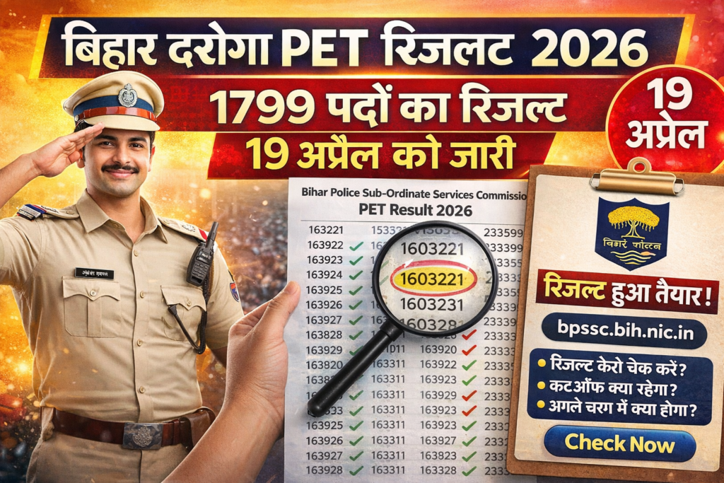 बिहार दरोगा भर्ती की PET परीक्षा में शामिल हुए उम्मीदवारों के लिए यह बड़ी खबर है कि 1799 पदों के लिए PET परिणाम 19 अप्रैल 2026 को जारी किया जाएगा।