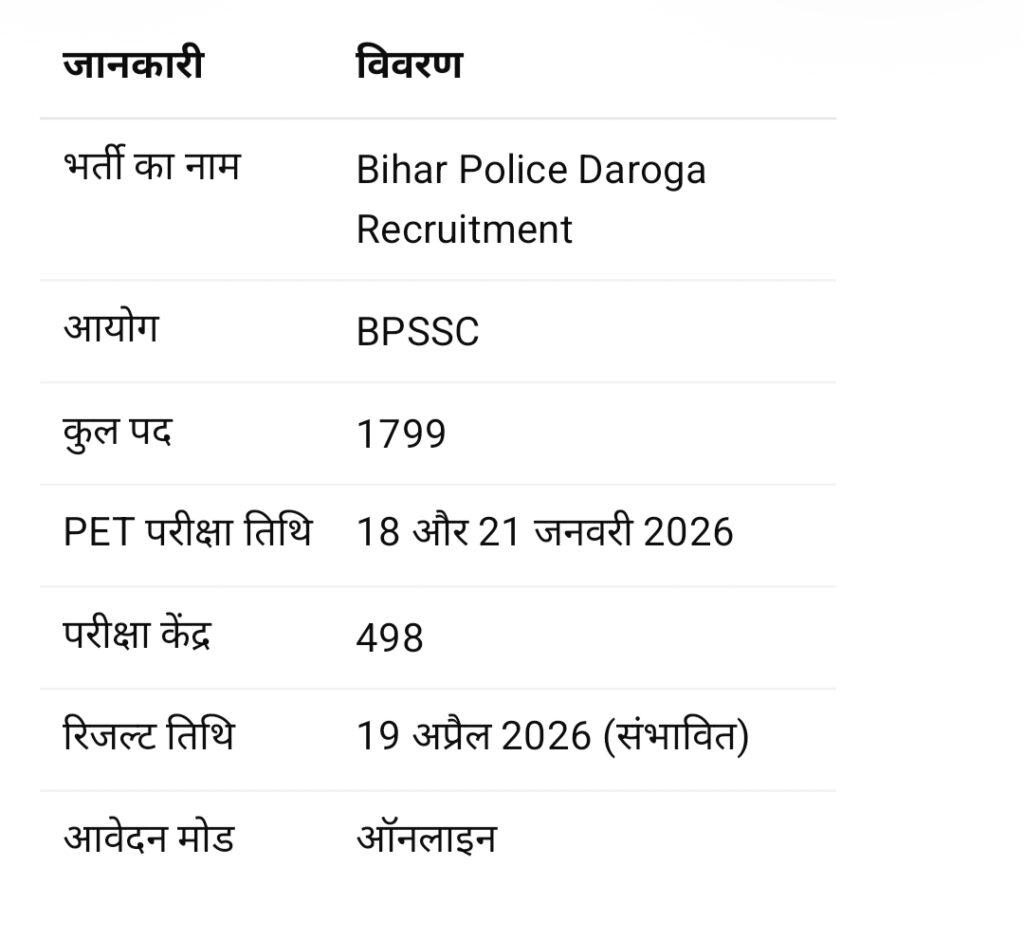बिहार में दरोगा भर्ती का इंतजार कर रहे उम्मीदवारों के लिए बड़ी खबर सामने आई है। Bihar Police Subordinate Services Commission (BPSSC) जल्द ही दरोगा भर्ती की PET परीक्षा का परिणाम 19 अप्रैल 2026 को जारी करने जा रहा है। इस भर्ती प्रक्रिया के तहत कुल 1799 दरोगा पदों को भरा जाएगा।