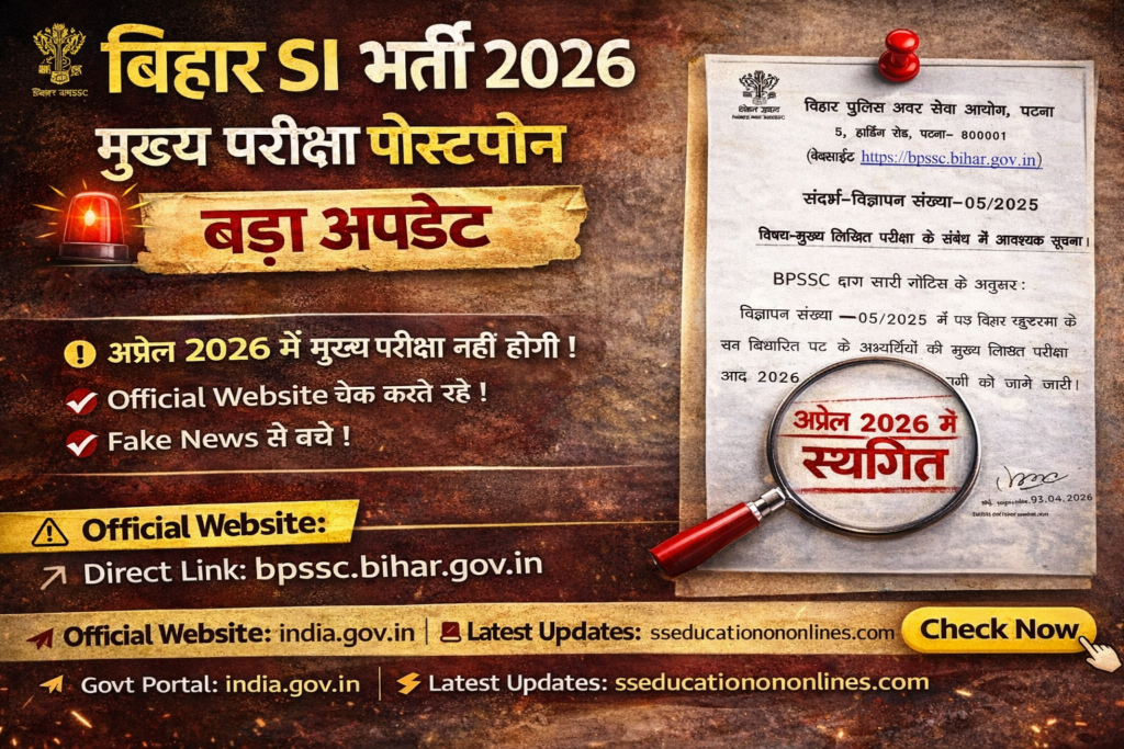 Bihar Police Subordinate Services Commission द्वारा जारी नोटिस से स्पष्ट है कि बिहार SI भर्ती 2026 की परीक्षा फिलहाल टाल दी गई है।