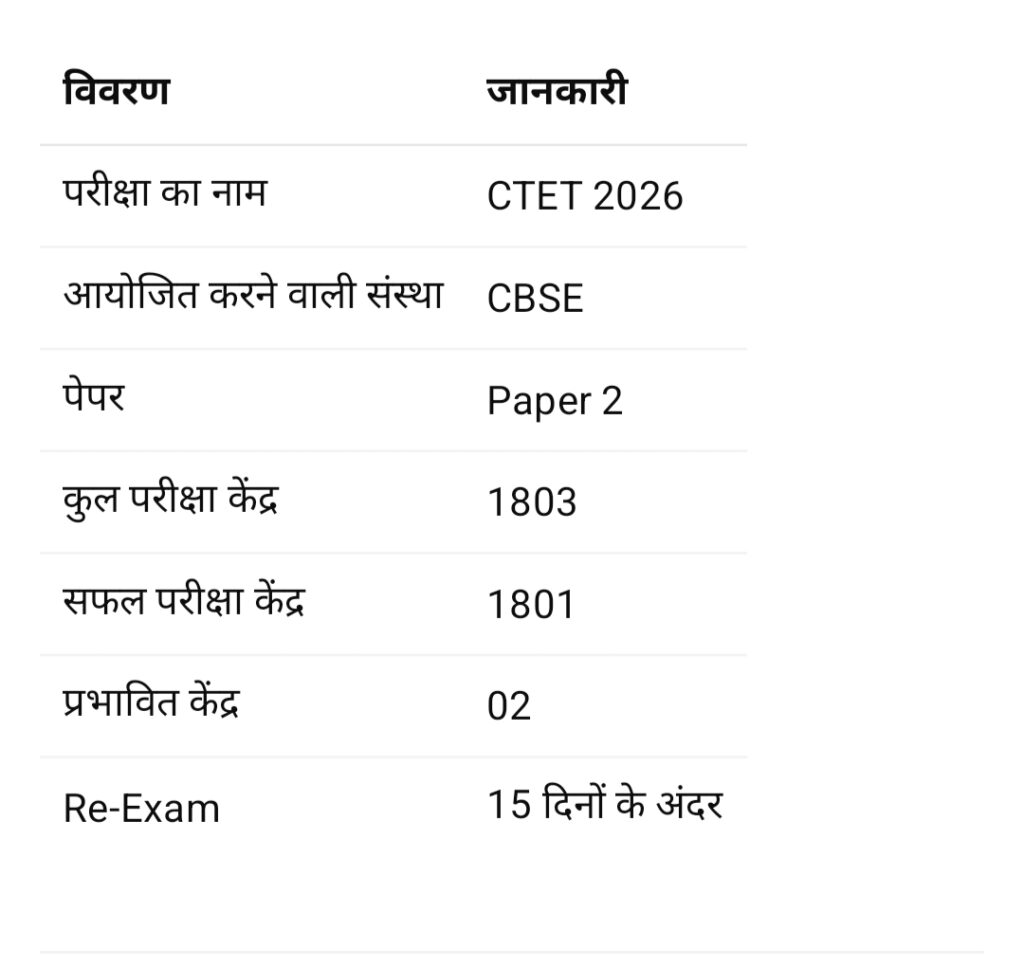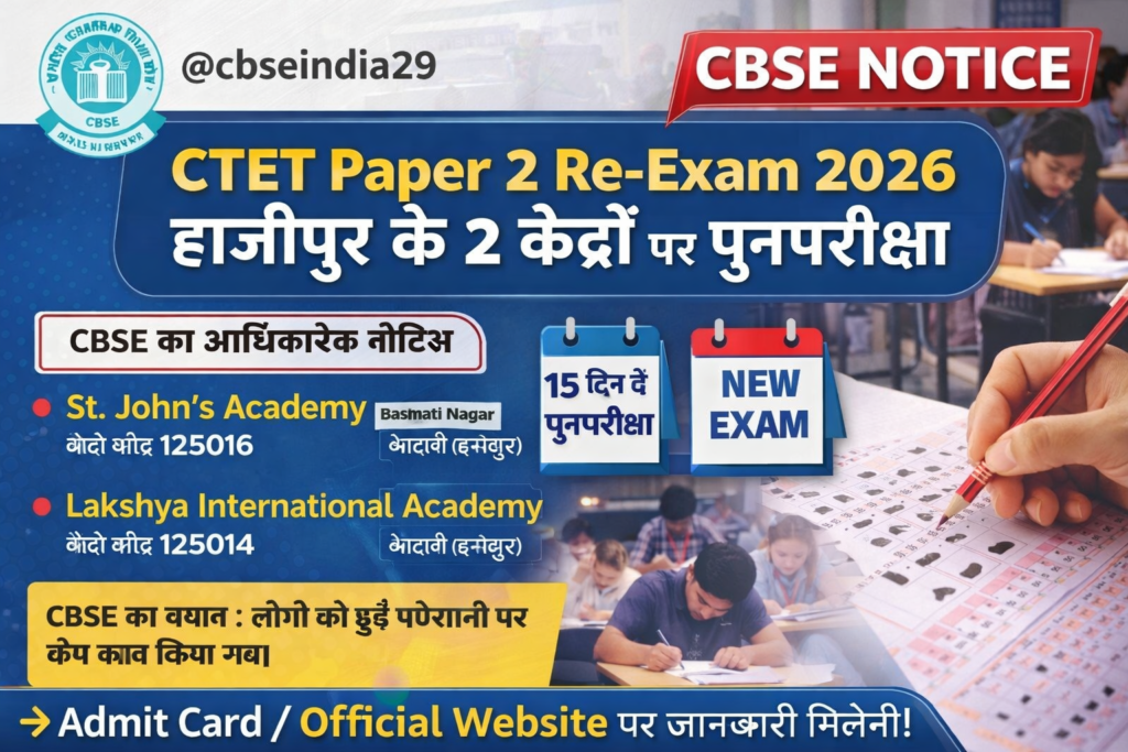 केंद्रीय शिक्षक पात्रता परीक्षा (CTET) 2026 से जुड़ी एक बहुत बड़ी और अहम खबर सामने आई है। CBSE मुख्यालय (CBSE HQ) ने CTET Paper-2 को लेकर आधिकारिक सूचना जारी की है, जिसमें बताया गया है कि देशभर के अधिकतर परीक्षा केंद्रों पर परीक्षा सफलतापूर्वक आयोजित हुई, लेकिन वैशाली (हाजीपुर) के 2 परीक्षा केंद्रों पर परीक्षा नहीं हो सकी।