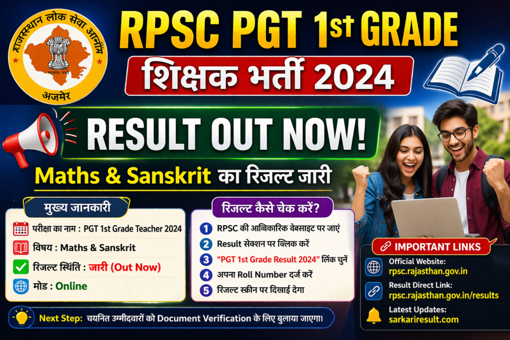 राजस्थान के हजारों अभ्यर्थियों के लिए बड़ी खबर सामने आई है। Rajasthan Public Service Commission (RPSC) ने PGT 1st Grade शिक्षक भर्ती 2024 का रिजल्ट जारी कर दिया है।