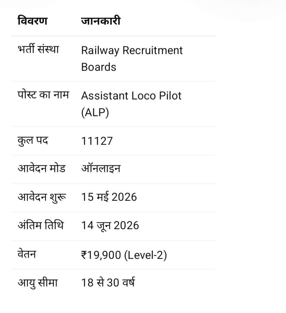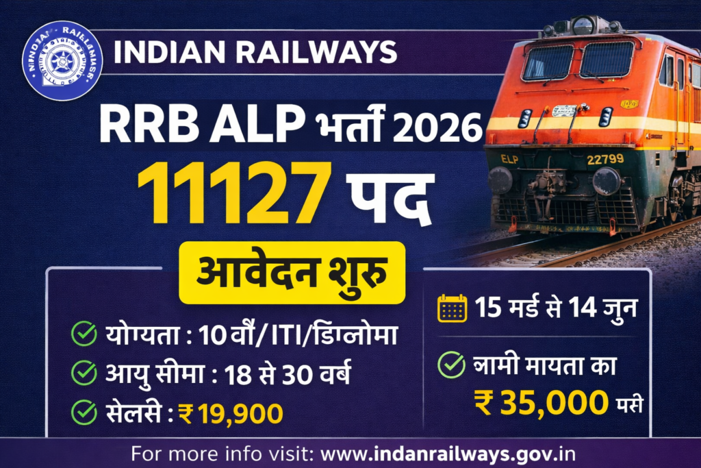 भारतीय रेलवे में नौकरी की तैयारी कर रहे युवाओं के लिए बड़ी खुशखबरी सामने आई है। Indian Railways के अंतर्गत Railway Recruitment Boards (RRB) ने Assistant Loco Pilot (ALP) Recruitment 2026 के लिए आधिकारिक नोटिफिकेशन जारी कर दिया है। इस भर्ती के माध्यम से पूरे भारत में 11127 पदों पर उम्मीदवारों की नियुक्ति की जाएगी।
