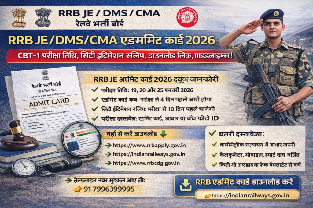 अगर आपने RRB JE 2026 के लिए आवेदन किया है, तो यह लेख आपके लिए एक संपूर्ण गाइड है। यहां आपको मिलेगा – RRB JE एडमिट कार्ड डाउनलोड लिंक, परीक्षा तिथि, सिटी इंटिमेशन स्लिप, चयन प्रक्रिया, परीक्षा पैटर्न और जरूरी दिशा-निर्देश।