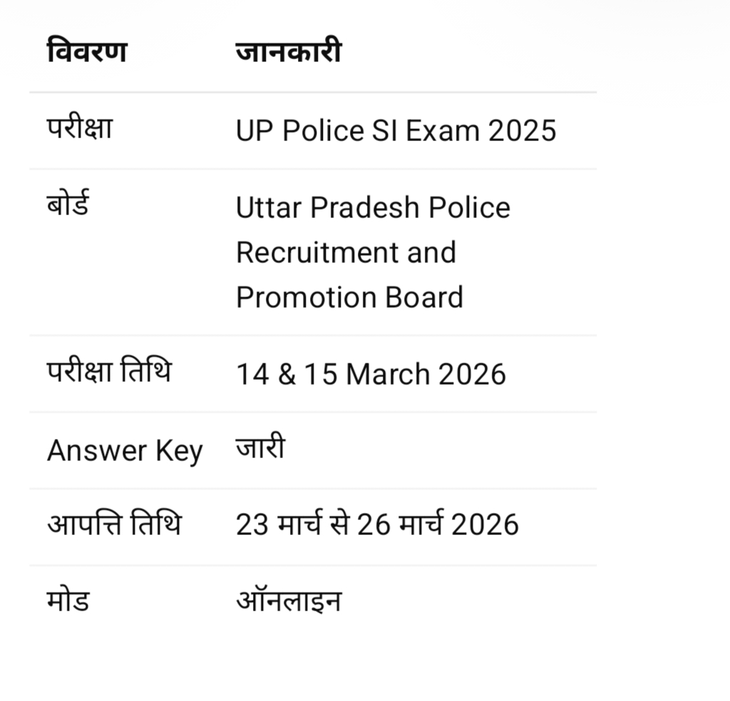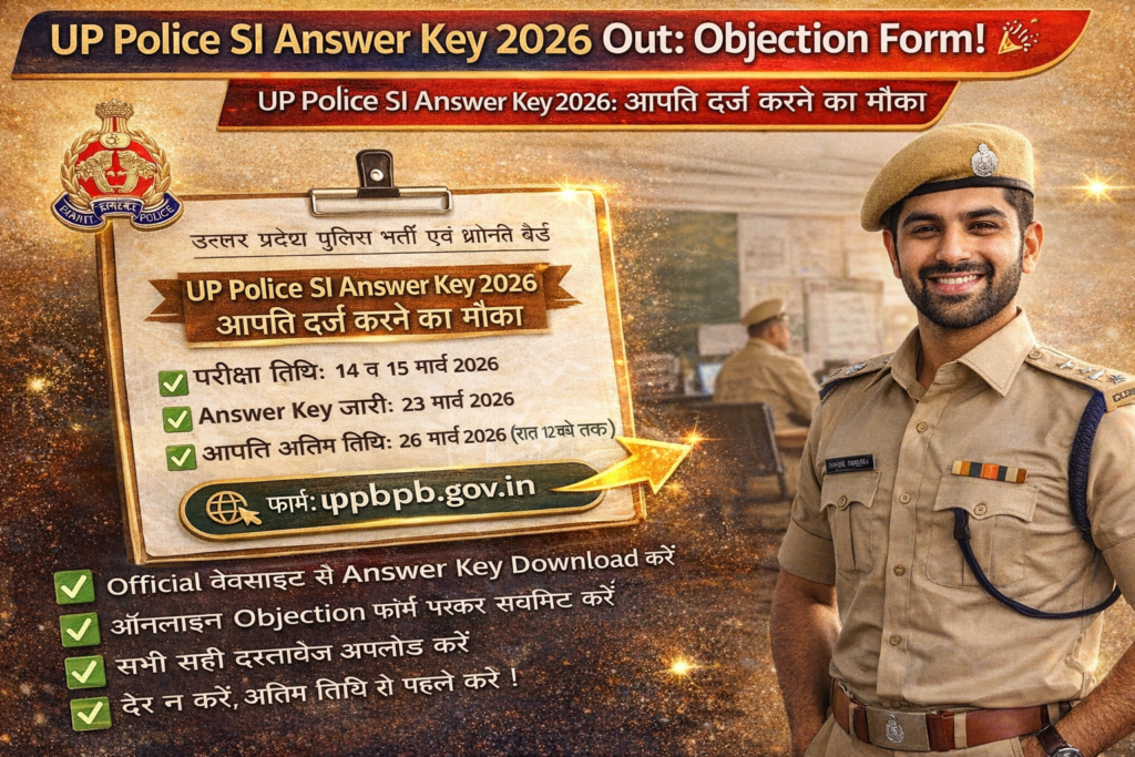 UP Police SI Answer Key 2026 जारी होने से अभ्यर्थियों को अपने प्रदर्शन का आकलन करने का मौका मिला है। Uttar Pradesh Police Recruitment and Promotion Board ने पारदर्शिता बनाए रखने के लिए आपत्ति दर्ज करने की सुविधा भी दी है।
