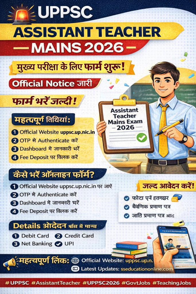 उत्तर प्रदेश लोक सेवा आयोग (UPPSC) ने Assistant Teacher (Trained Graduate Grade) Mains Exam 2025-26 को लेकर एक महत्वपूर्ण सूचना (Notification) जारी कर दी है। इस नोटिस के अनुसार, मुख्य परीक्षा (Mains Exam) के लिए ऑनलाइन आवेदन प्रक्रिया (Online Application Process) शुरू होने जा रही है।