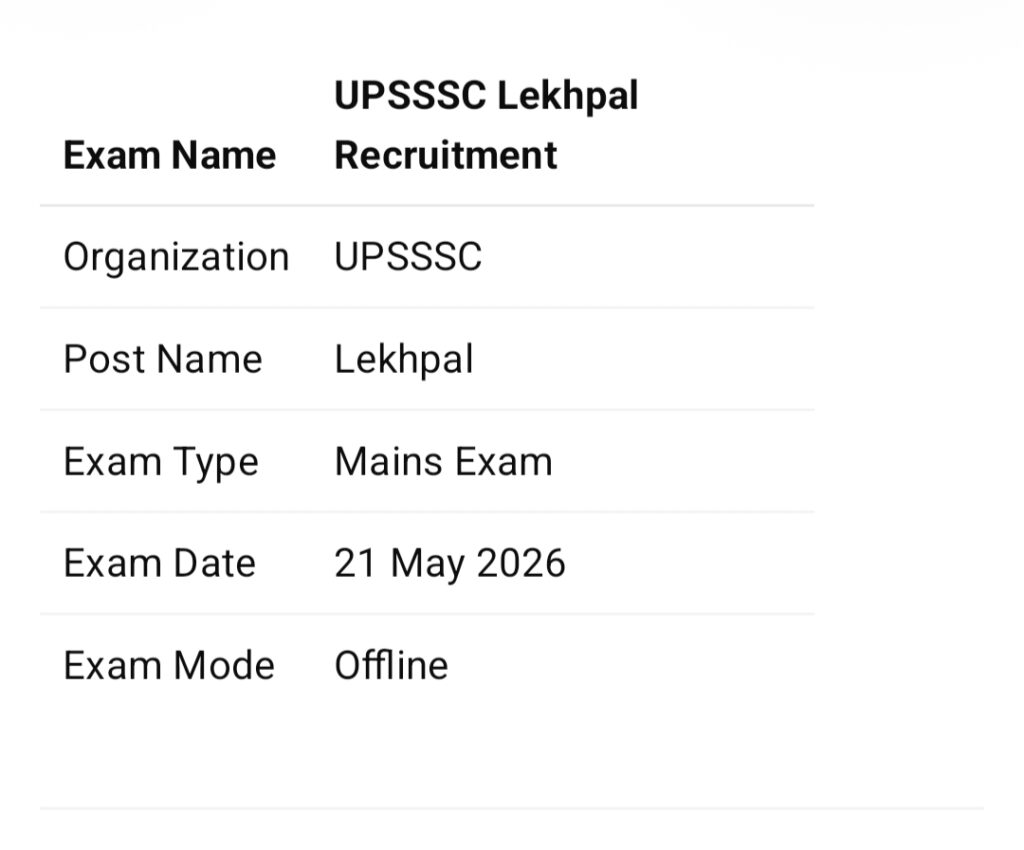 इस लेख में हम आपको UPSSSC Lekhpal Mains Exam Date 2026, परीक्षा पैटर्न, एडमिट कार्ड, चयन प्रक्रिया और जरूरी जानकारी के बारे में पूरी जानकारी देंगे।